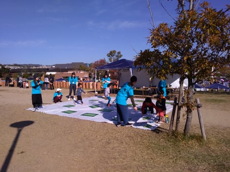 古墳グッズ「こふんえあわせ」を屋内外のイベント向けに大きく作りました。上の写真右は大阪・高槻にある今城塚古墳で開催された「はにコットフェス」での様子です。あそびを通じて古墳の形状を知ってもらいたくてつくりました。